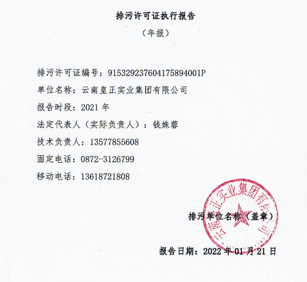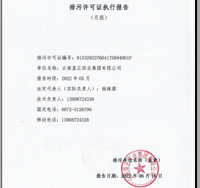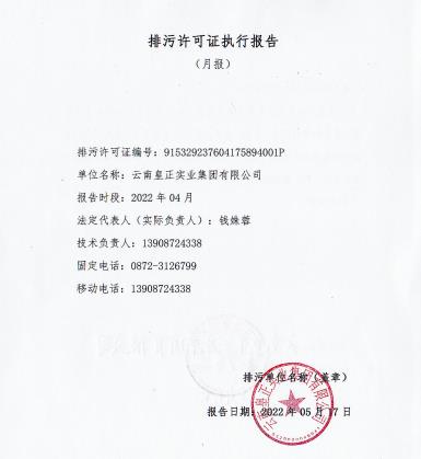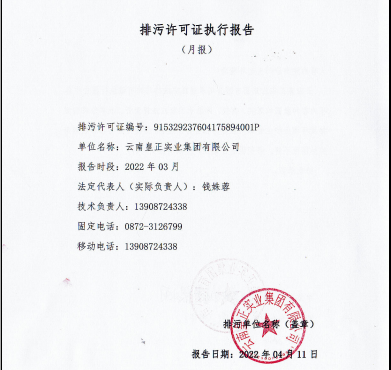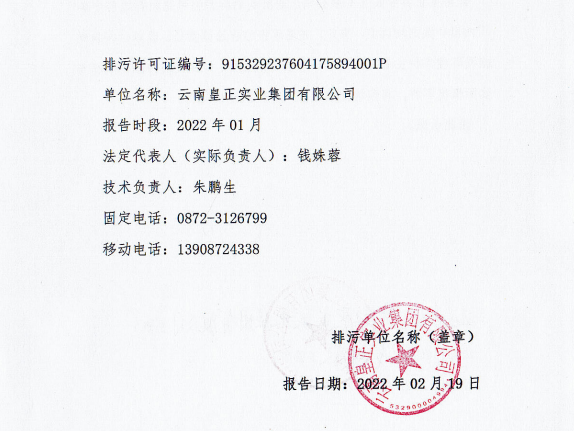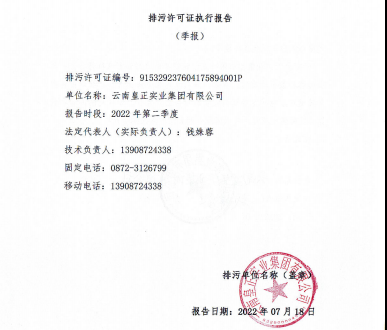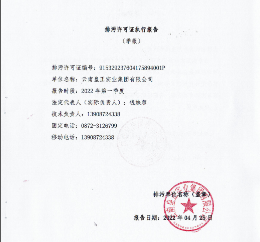 2022年云南皇正實(shí)業(yè)集團(tuán)有限公司排污許可證季報(bào) - 第一季度 2022年云南皇正實(shí)業(yè)集團(tuán)有限公司排污許可證季報(bào)-第一季度