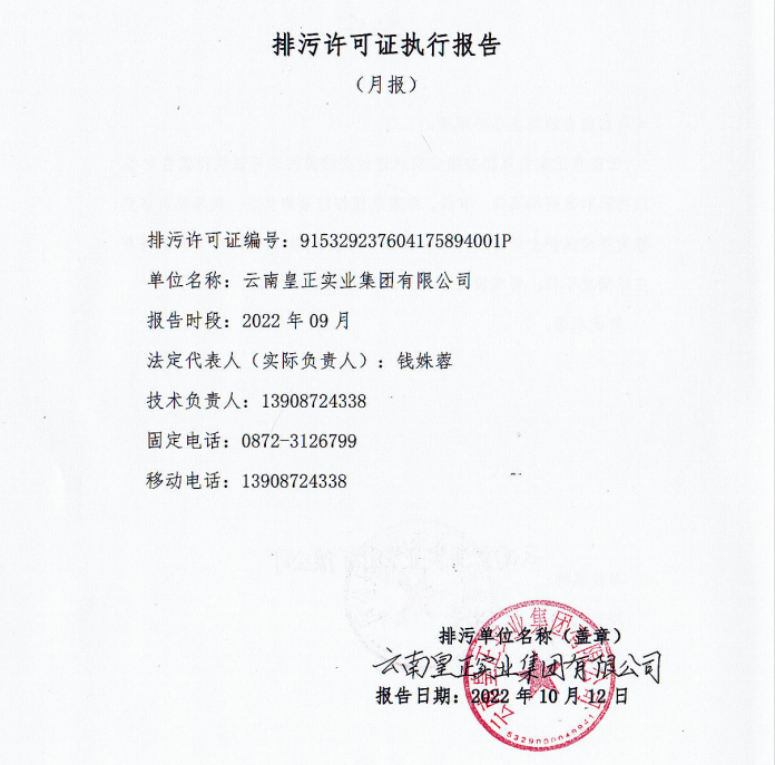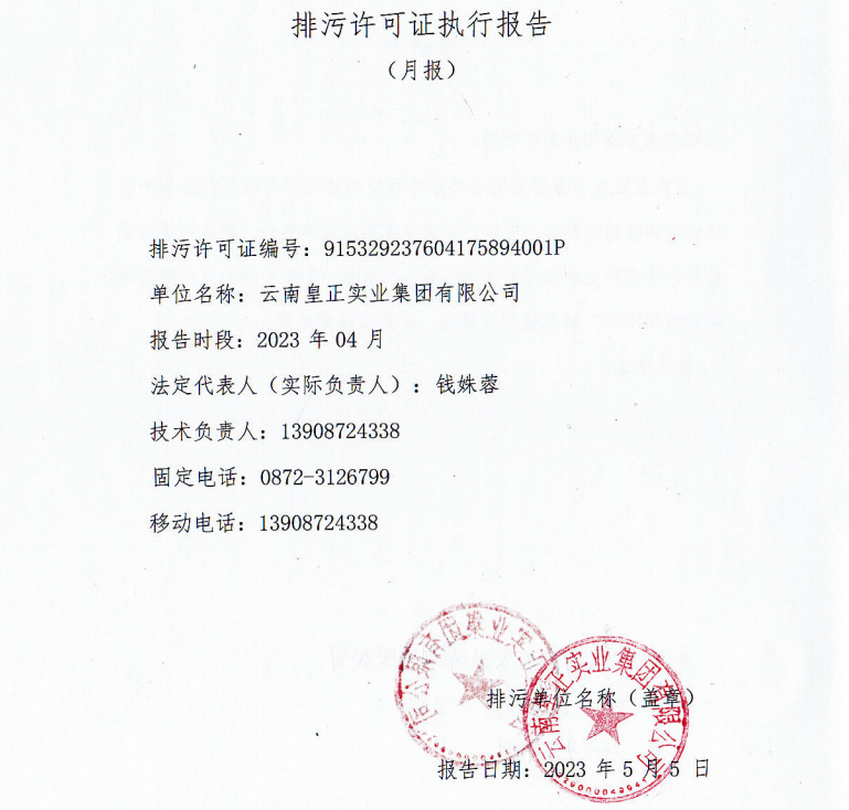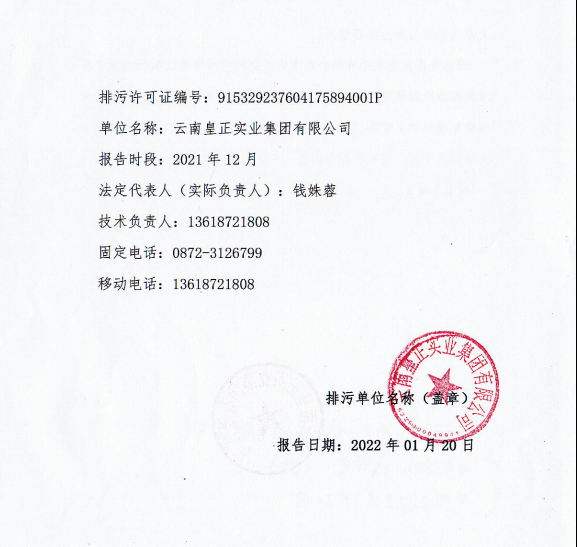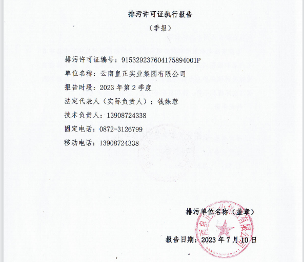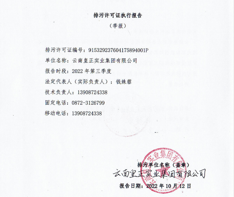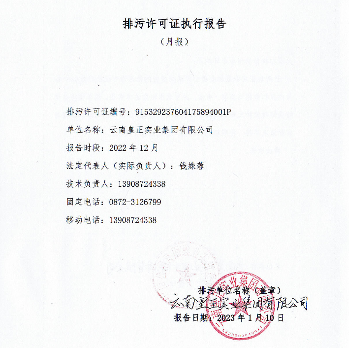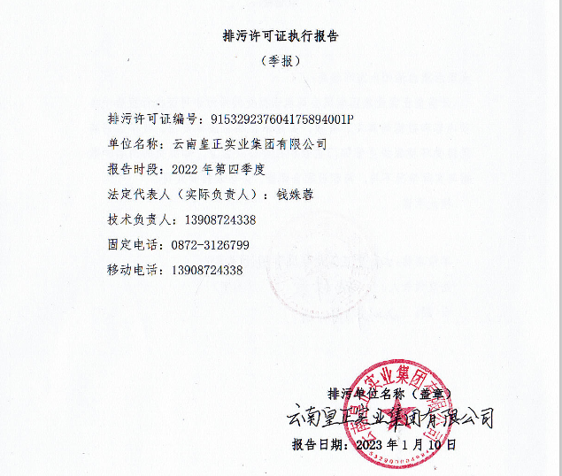 2022年云南皇正實(shí)業(yè)集團(tuán)有限公司排污許可證季報(bào) - 第四季度 2022年云南皇正實(shí)業(yè)集團(tuán)有限公司排污許可證季報(bào)-第四季度