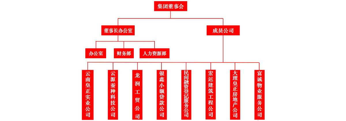 皇正集團(tuán)母公司為云南皇正實(shí)業(yè)集團(tuán)有限公司,是云南省農(nóng)業(yè)產(chǎn)業(yè)化重點(diǎn)龍頭企業(yè),主要從事蠶桑種養(yǎng)、蠶繭收烘,白廠絲和絲綿制品加工銷售。主要產(chǎn)品有生絲、蠶絲被以及絲綿制品。旗下子公司有祥云縣龍潤工貿(mào)有限公司,主要從事硫酸生產(chǎn)、鋅焙砂加工、硫鐵礦加工銷售;祥云縣宏運(yùn)建筑工程有限公司,具有二級(jí)建筑資質(zhì),主要從事房建工程、市鎮(zhèn)工程、農(nóng)田水利工程以及各類土石方工程施工;大理皇正房地產(chǎn)有限公司(原祥云縣金宏房地產(chǎn)開發(fā)有限公司),從事房地產(chǎn)開發(fā)與置業(yè),在縣內(nèi)開發(fā)建設(shè)了花鳥市場、彩云居、理想家園等住宅小區(qū);大理州云源蠶種科技有限公司,從事蠶種生產(chǎn)、銷售;祥云縣銀鑫小額貸款有限公司,主要從事縣內(nèi)各項(xiàng)小額貸款;財(cái)務(wù)咨詢業(yè)務(wù);祥云銀龍民間融資登記服務(wù)有限公司,主要提供投融資項(xiàng)目咨詢、投融資策劃、投融資對(duì)接、交割監(jiān)督等服務(wù);祥云縣富誠物業(yè)服務(wù)有限公司從事物業(yè)管理。成員單位為祥云縣蠶桑協(xié)會(huì),是一個(gè)在龍頭企業(yè)帶動(dòng)下建立起來的協(xié)會(huì),有會(huì)員1萬多個(gè),是大理州農(nóng)技協(xié)聯(lián)合會(huì)團(tuán)體會(huì)員。協(xié)會(huì)建立了由公司、站、中心輔導(dǎo)員、小蠶共育戶四級(jí)組成的科技推廣服務(wù)體系,主要從事縣內(nèi)蠶桑生產(chǎn)技術(shù)推廣及服務(wù)。